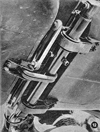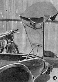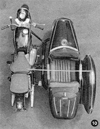 Das Motorrad DKW RT 350 mit Binder-Seitenwagen im TestDer Binder-SeitenwagenDie Auto Union empfiehlt zu ihren Fahrzeugen als Ausrüstung spezielle Zubehörfabrikate, sei das nun bei Wagen oder bei Motorrädern. So gehört zum Zubehörprogramm der Auto Union auch der Binder-Seitenwagen, dessen äußeres Gesicht, insbesondere die Bugverkleidung, den DKW-Wagen entspricht. Das erste Stück hatte eine reichlich große Spurweite, 116 cm — für diese Maschine unnötig viel. Auch sonst stimmte einiges an diesem ersten Muster noch nicht, das derzeit noch laufende Stück hat nur noch 1,10 m Spurweite und fährt sich erheblich besser. (Auch über die Spurweite von Seitenwagen wird nächstens noch viel zu sagen sein, wir haben gefunden, daß schmale Seitenwagen keineswegs nur im Gelände, sondern erst recht auf der Straße viel schöner und schneller sind als breite Gespanne.) Mit etwas Geduld wären beim Binderwagen gut nochmal 80—100 mm zu sparen, zumal der in die Karosserie einbezogene Seitenrad-Kotflügel dies besonders begünstigt. Die Seitenradfederung ist ein bißchen hart — man merkt das aber erst an einer Schwingenmaschine, daran sind aber die meisten Seitenradfederungen merkbar zu hart, nicht bloß die des Binderwagens. Das Boot ist im Sitzraum sehr breit und geräumig, einzufädeln braucht man sich auch nicht, weil sich der Oberteil der Karosse aufklappen läßt — jetzt sind sogar die Fugen dicht. Es wäre kein Schaden, das Boot vorn nicht so stark zu verjüngen wie jetzt, sondern erheblich breiter zu lassen, die Chromleisten würden nach wie vor Schmalheit vortäuschen, aber der Mann drin hätte mehr Platz für die Füße — nach der dritten Fahrstunde wird so etwas wichtig. Der Gepäckraum ist sehr geräumig, der Deckel sogar dicht, nur braucht man für einen aufzuschnallenden Koffer noch eine besondere Kofferbrücke. Die Bodenfreiheit ist besonders groß, es war wirklich kein Problem, damit auch die Dreitagestrecke zu bewältigen.